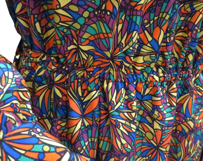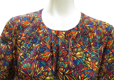 作製したワンピースをご紹介します。万華鏡を覗いたようなカラフルな幾何学模様のプリント柄。