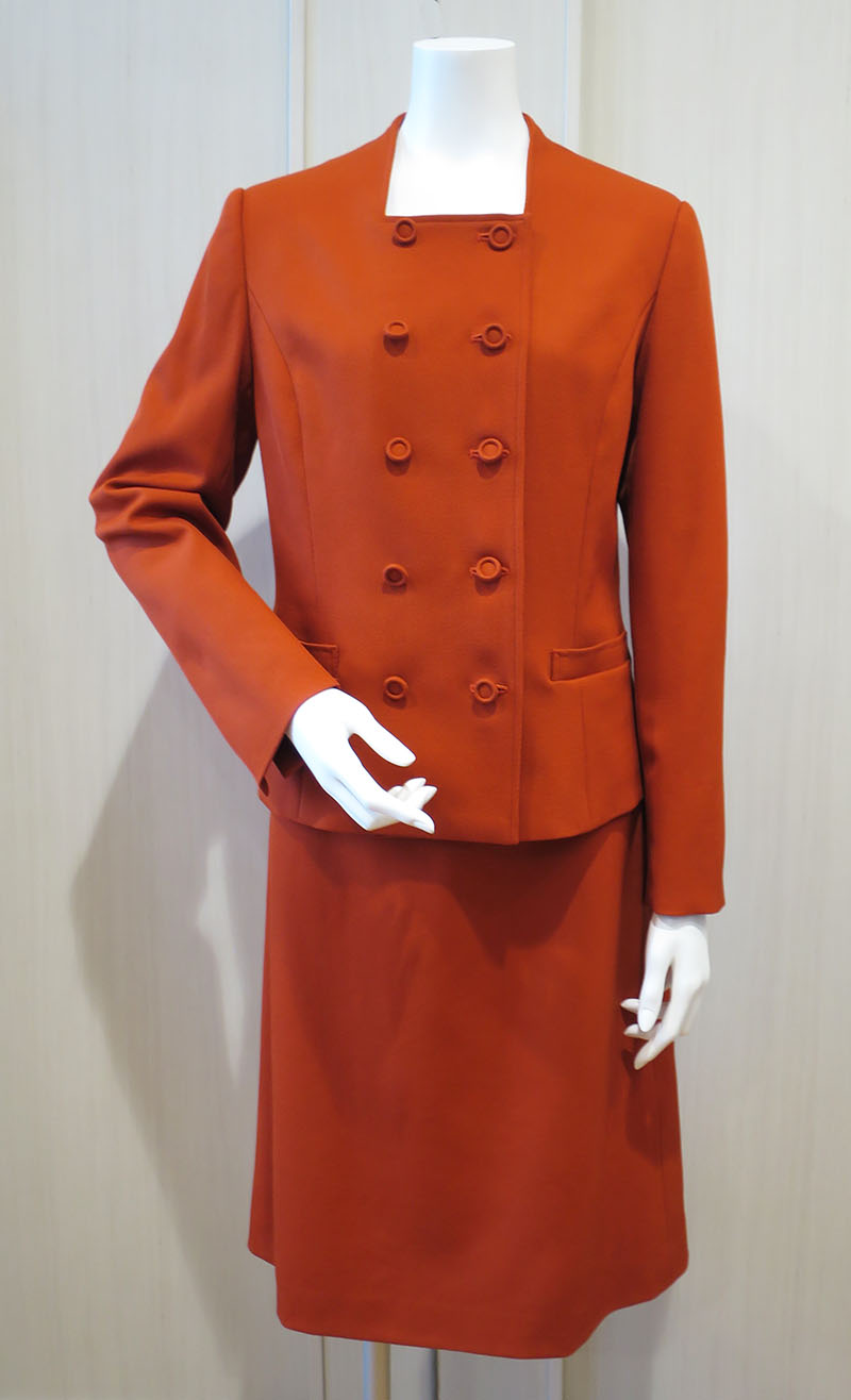 ある女性らしいスーツをご紹介します。スクエアーカットの衿ぐりは後ろ衿を少し立ち上げているので、