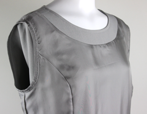 ネックポイントから少し離れた襟ぐりは首から肩へのラインがスッキリと見えます。 少しハイウェストの切り替えとセミフレアーのスカートで、ウェストから腰の流れるようなラインを作りました。 身頃は立体裁断で自然に包むようなパネルラインに仕上げています。