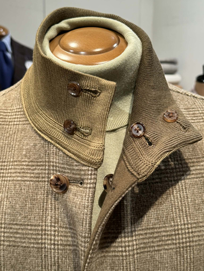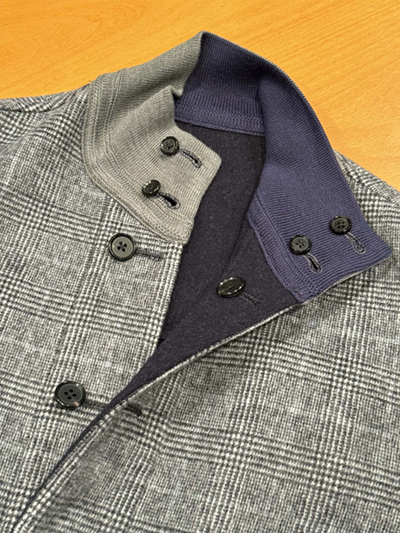 口を貫通 させてフラップが両面で使用出来る、他にはないオリジナルモデルです。襟と袖口のニットも、両面の生地に合せた秋冬らしい色合いの物にしています。コーディネイトは、インナーにはタートルネック等のニットや、起毛した様なカジュアルシャツがお薦めですが、ニットタイでタイドアップしたスタイルもエレガントです。ボトムスには生地のボリューム感を合せたフランネルやツィード、コーデュロイ等が良いと思います。