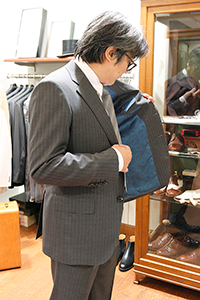 | A様: | きれいですね。全然嫌みじゃないですね。むしろ、しっくりきている。こだわりのあるスーツの感じがしてとても気に入りました。 |