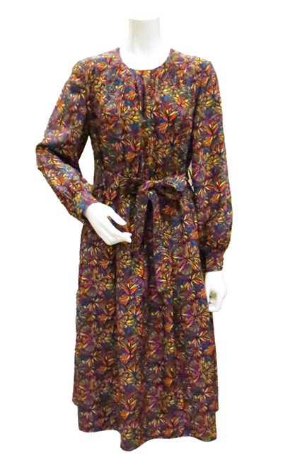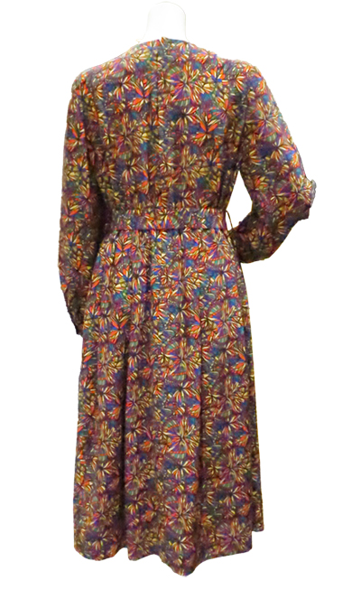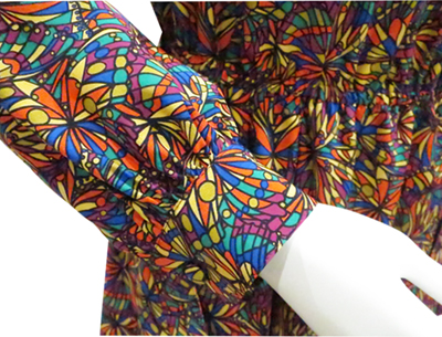 作製したワンピースをご紹介します。万華鏡を覗いたようなカラフルな幾何学模様のプリント柄。