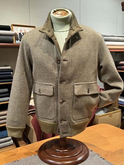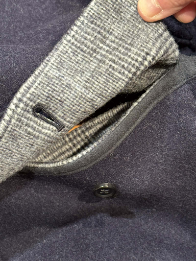 口を貫通 させてフラップが両面で使用出来る、他にはないオリジナルモデルです。襟と袖口のニットも、両面の生地に合せた秋冬らしい色合いの物にしています。コーディネイトは、インナーにはタートルネック等のニットや、起毛した様なカジュアルシャツがお薦めですが、ニットタイでタイドアップしたスタイルもエレガントです。ボトムスには生地のボリューム感を合せたフランネルやツィード、コーデュロイ等が良いと思います。